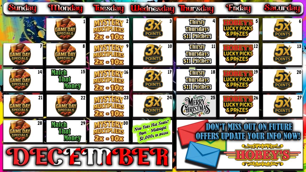 Join Hobey’s Premier Player’s Club.  It’s Fast and it’s Free.  At Hobey’s, We Reward Our Players with Great Promotions, Benefits and Rewards. (Based on carded play)